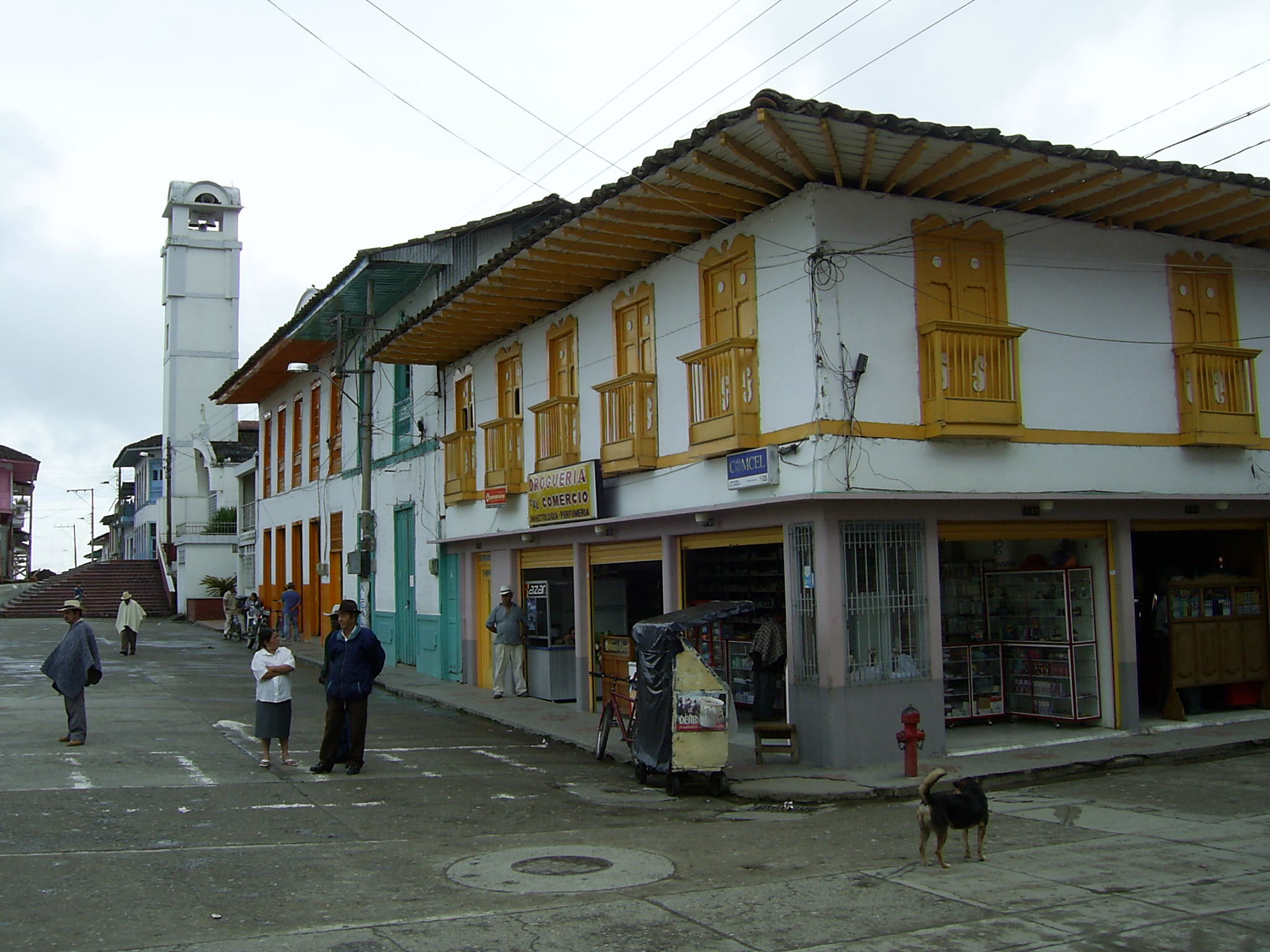 El Cairo, Valle del Cauca. Fundado en 1920, por Pedro Arango y otros. Nombres: Las Vueltas, Haceldama. Municipio desde 1947. Economía importante en agricultura, caficultura, entre otros. Observamos en la imagen, espacio urbano. Apreciamos la iglesia, la droguería, gente