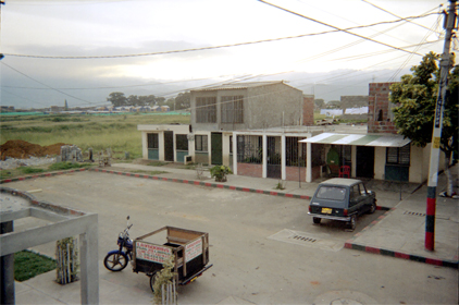 Villada Salazar, L. F. (2005). Se observa una calle de barrio en la cual se encuentran parqueados una moto y un vehículo, en el plano medio residencias. Santiago de Cali: Biblioteca Departamental Jorge Garces Borrero.