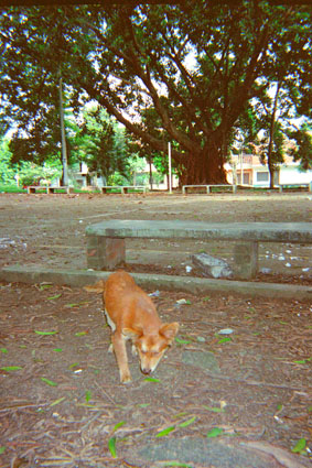 Plano medio. Imagen tomada en exterior, donde se puede apreciar un perro de color café en un parque, junto a un poste. Al fondo una cancha de baloncesto. Imagen tomada con luz de flash.