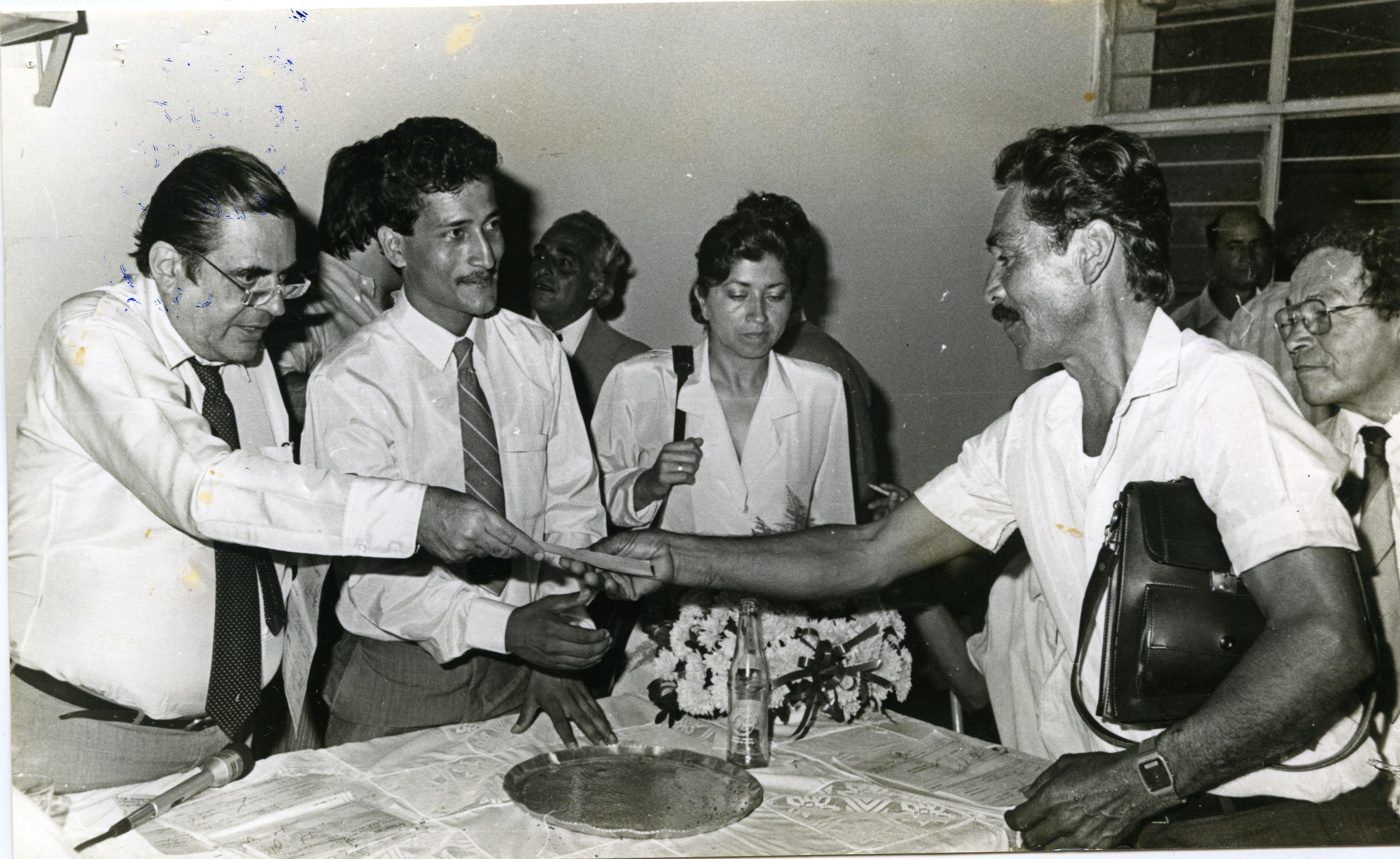La foto muestra el momento donde el entonces gobernador del Valle del Cauca, Ernesto González Caicedo entrega un auxilio económico en el municipio de Zarzal.