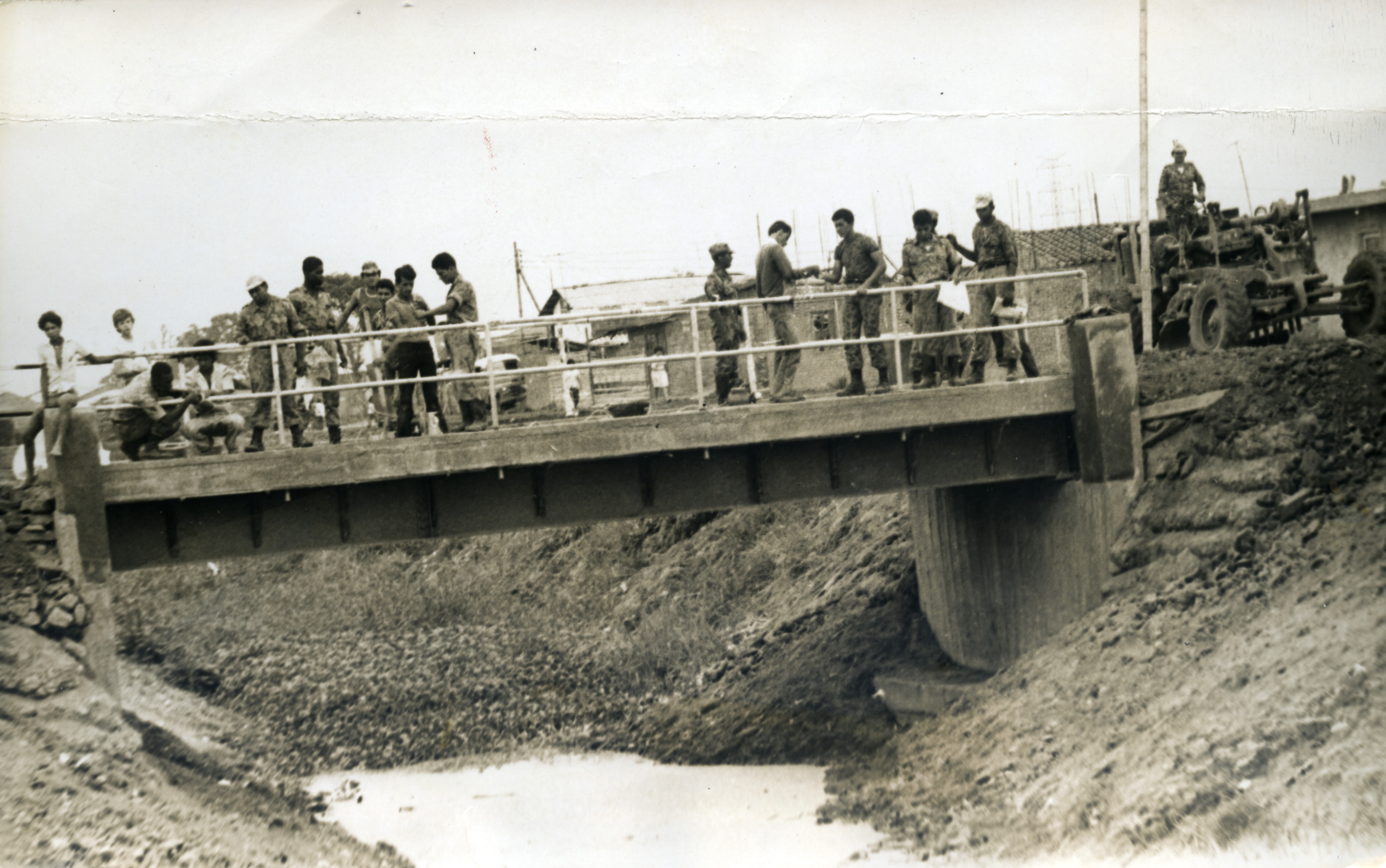 Al reverso de la fotografía dice: Ayer se le daban los últimos toques al puente construido por el Ejército y la comunidad, el cual desde hoy, une a los barrios Marroquín y Los Comuneros del Distrito de Aguablanca. El puente vehicular que tiene una capacidad de 30 toneladas será inaugurado por el ministro de Defensa, general Miguel Vega Uribe.