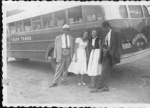 Evaristo Cuartas, Violet Lozano y Epaminda Franco, de paseo en Ricaurte. Al lado los buses de Transporte público Trans Tobar. Ricaurte, 1952.