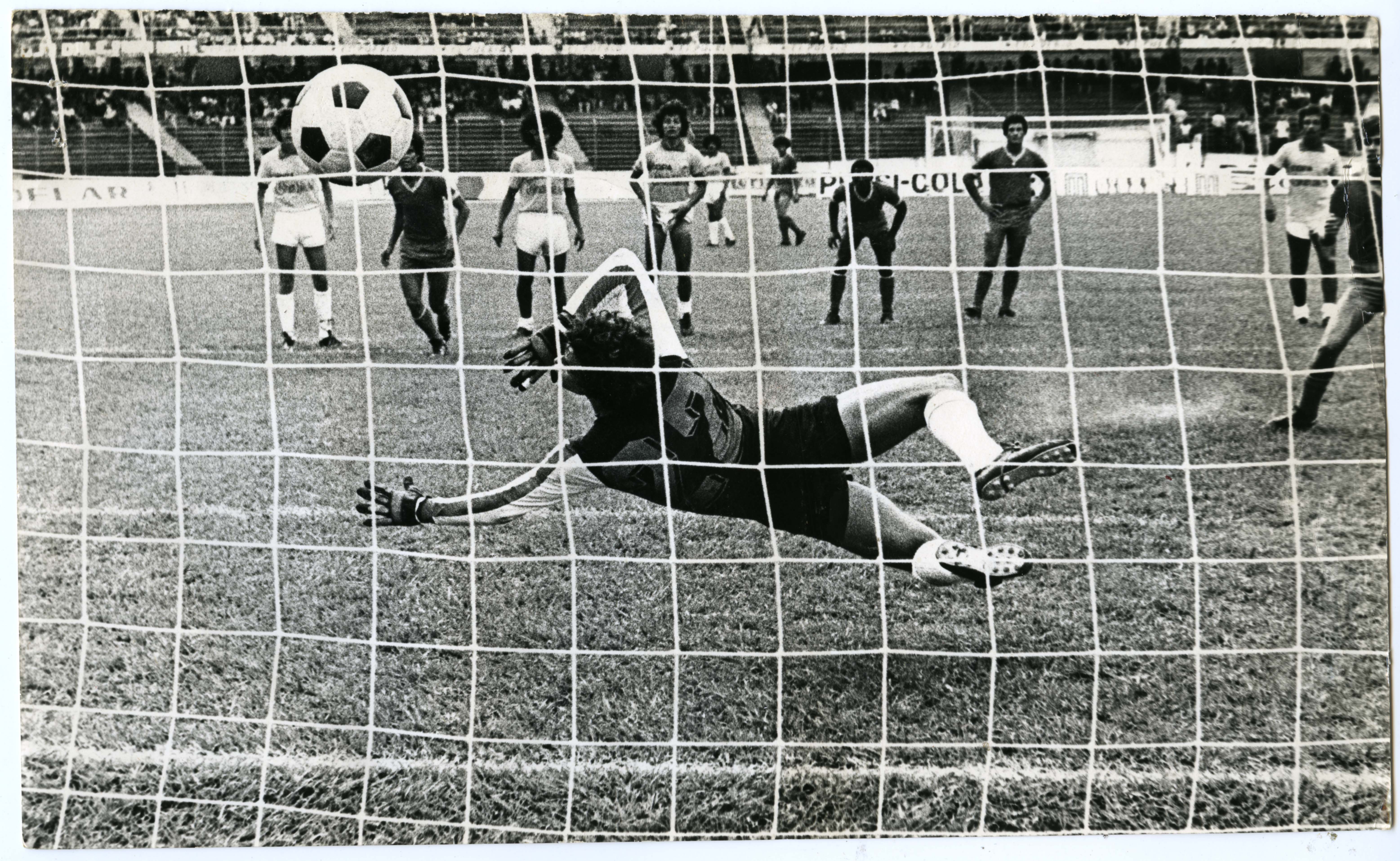 Escena del partido América de Cali frente al Bucaramanga, se observa al arquero Absalon Marínez intentando atajar un cobro de pena máxima.
