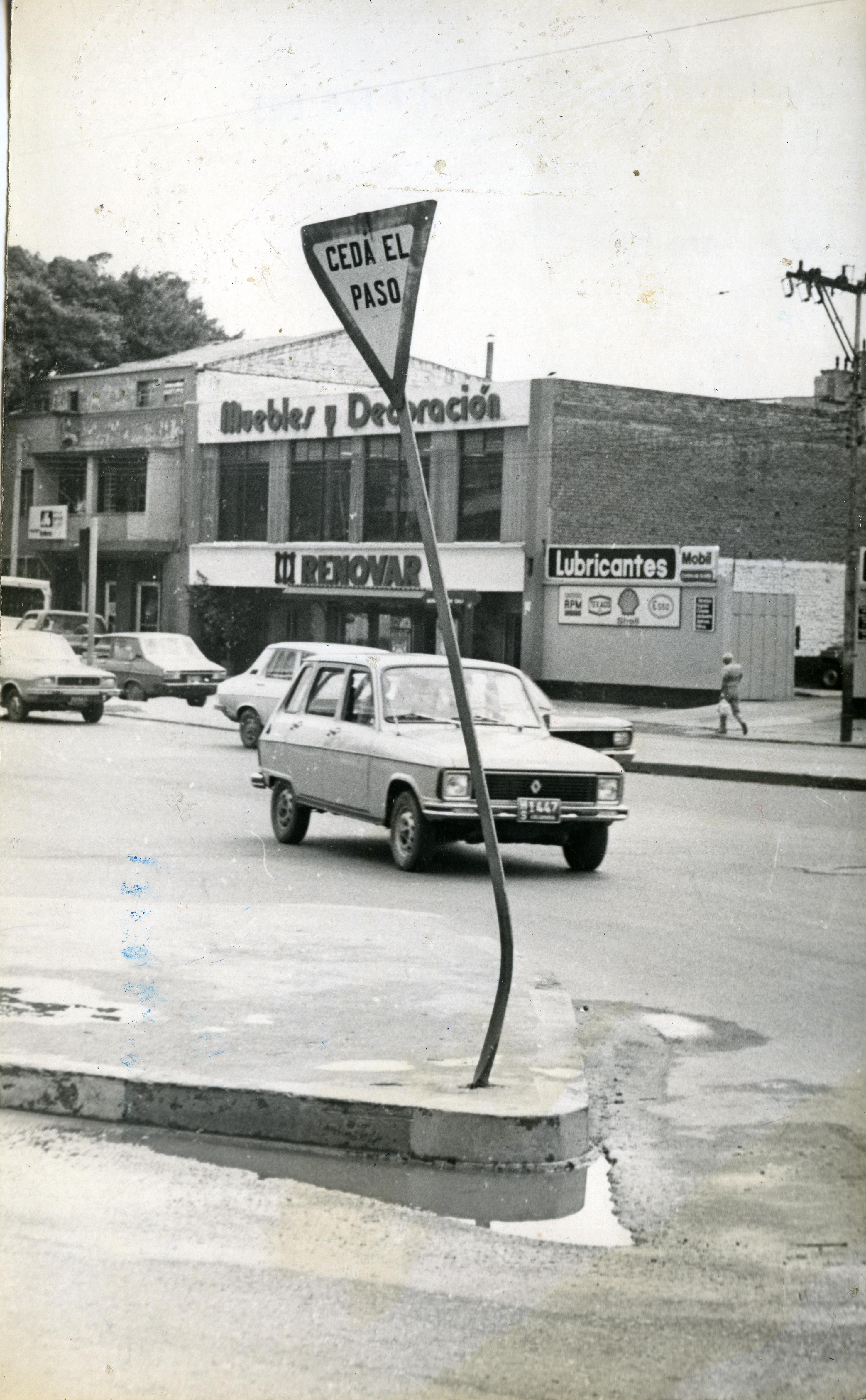 En la gráfica se observa una señal de "CEDA EL PASO" doblada. Se observa un automóvil transitando la carretera. Esta foto pertenece a la sección "Chiva Tita" del Diario Occidente.