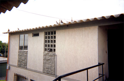 Plano medio. Exterior día. Toma de planta alta de casa en unidad residencial. Superficie rugosa de pared. Detalle de retícula con paloma en el borde.