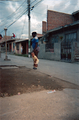 | dc.description | Imagen tomada en exterior, donde se aprecia una vía pavimentada en la cual hay una mujer y una niña. Al fondo la fachada de varias viviendas. Toma realizada con escasas condiciones de luz. | spa |