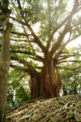 Plano Medio. Un árbol de caucho con follaje frondoso ocupa la totalidad del formato, donde se resalta la textura generada por las raíces y los bejucos que salen de sus ramas. Algunos rayos de luz pasan entre sus ramas.