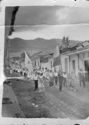 Desfile de estudiantes de escuelas y colegios por la vía principal del municipio. Dagua, 1952.
