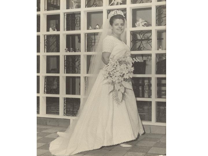 María Victoria Echeverry Mercado posando con su vestido de novia, el día de su matrimonio con Raul Cucalón Millán