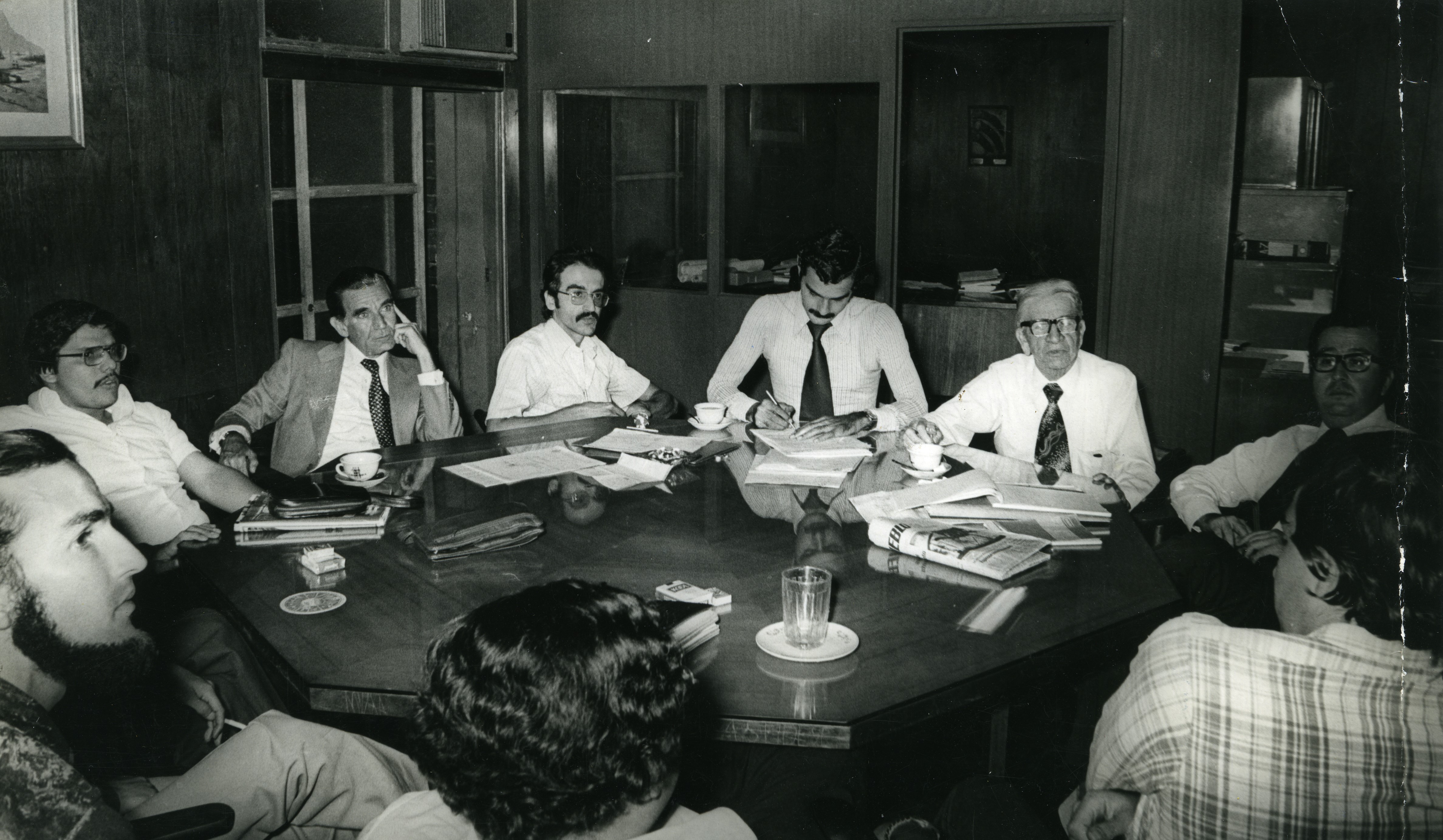 Reunión del Consejo Superior de la Universidad. Al reverso hay un recorte de periodico: ¨Consejo Superior de USACA en sesión; máximo organismo encargado de resolver todos los problemas de la Universidad.¨