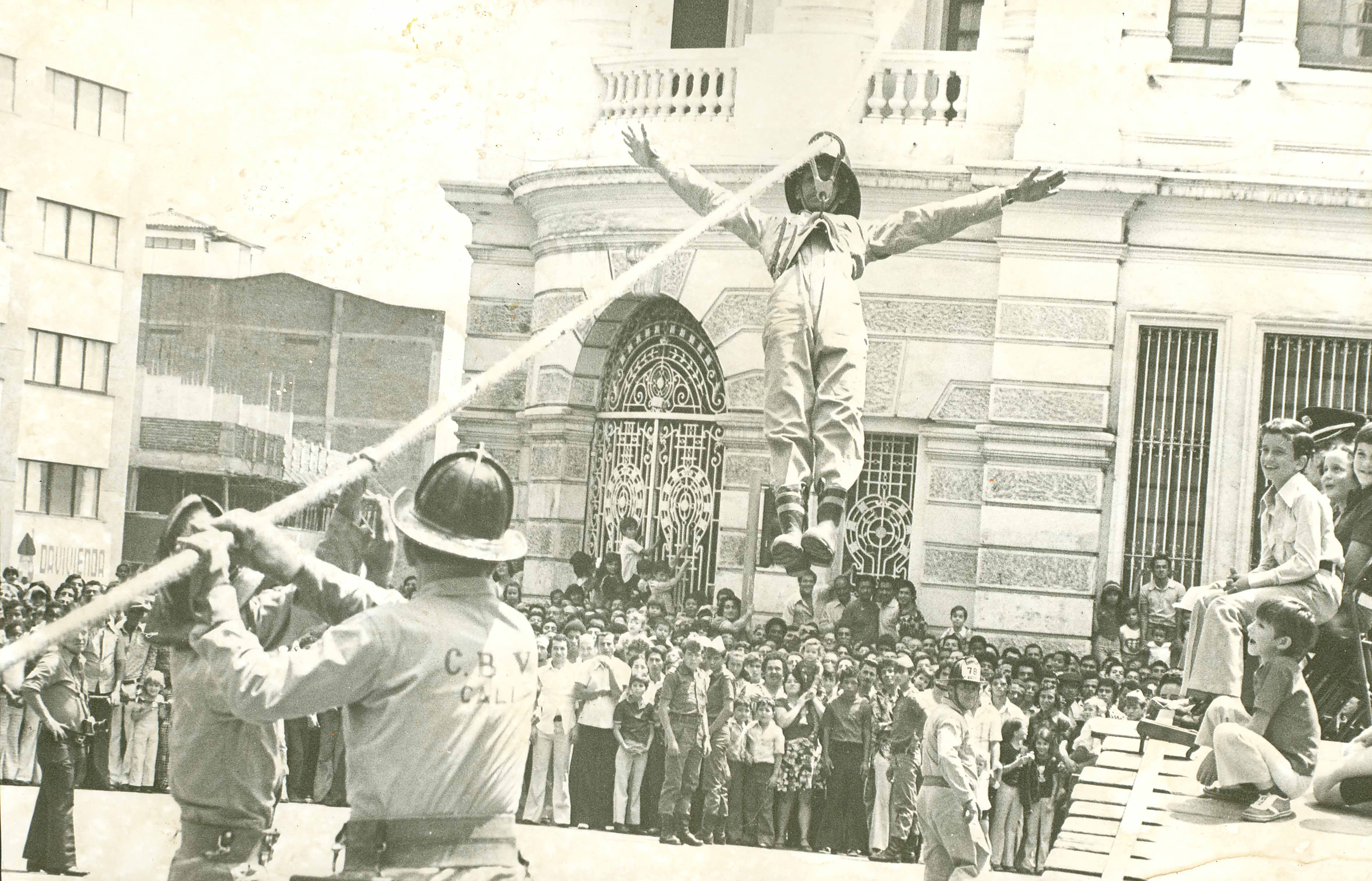 Miembros del Benemérito Cuerpo de Bomberos Voluntarios de Cali realizando maniobras de ejercicio en la Plaza de Cayzedo. El Archivo del Patrimonio Fotográfico y Fílmico del Valle del Cauca es responsabilidad de la Biblioteca Departamental del Valle Jorge Garcés Borrero, por convenio de cooperación suscrito con la Secretaria del Cultura Departamental, con el fin de aunar esfuerzos para su conservación, preservación y divulgación del Archivo entre la comunidad Vallecaucana, especialmente entre los estudiantes e investigadores que visitan la Biblioteca, propiciando el su uso y consulta permanente. La universidad Icesi es un colaborador en el proceso de difusión, facilitando la tecnología que permite la consulta de las imágenes.