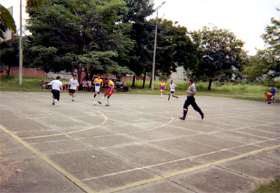 Plano de contexto. Hombres en cancha de fútbol. Perspectiva diagonal. Imagen en movimiento.