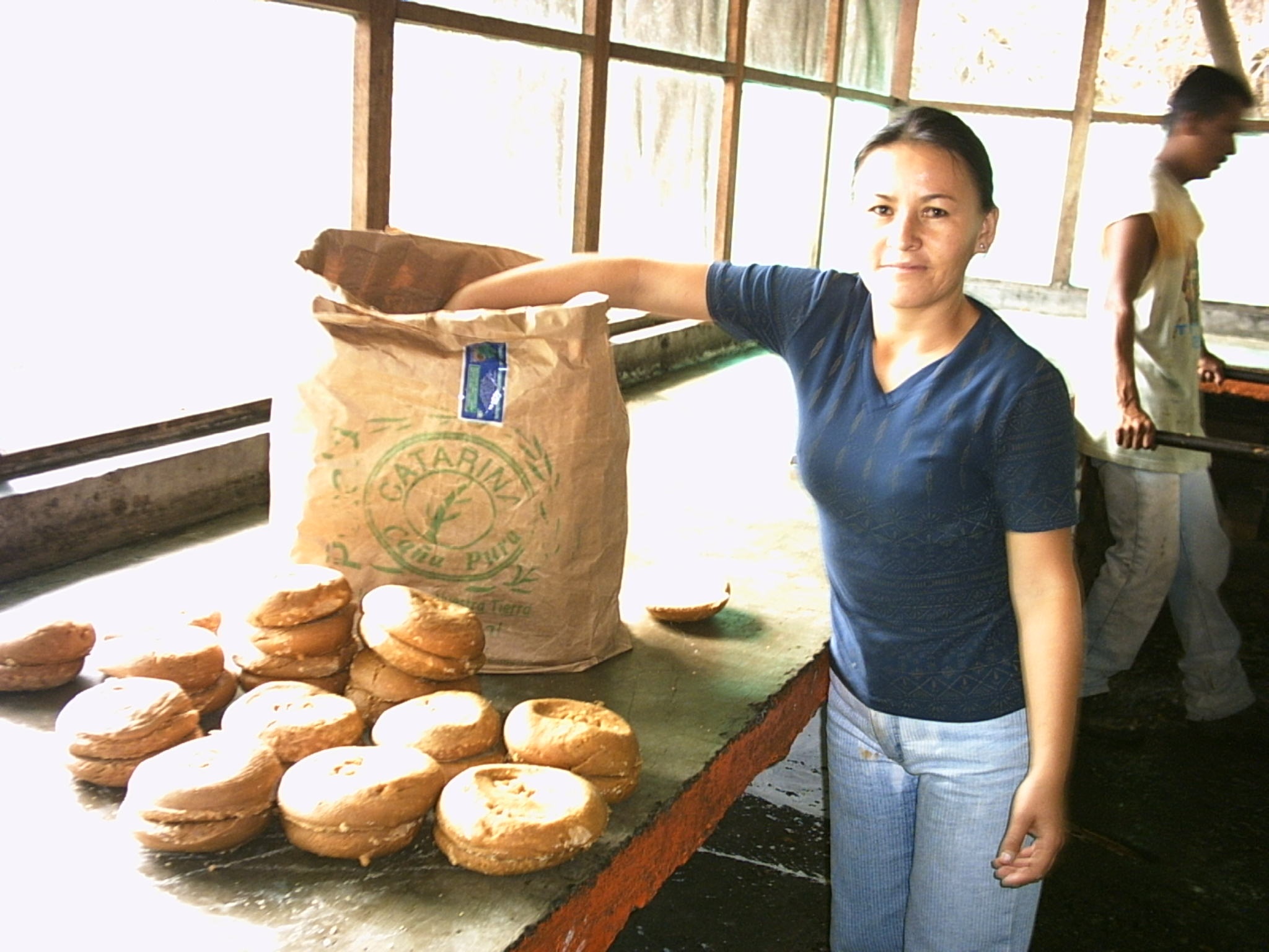 Ansermanuevo, Valle del Cauca. Fundado 15 agosto de 1539, por el Mariscal Jorge Robledo, Se convirtió en municipio por ordenanza 29 de abril de 1925. Apreciamos mujer haciendo el embalaje de panela y un hombre con una carreta transportando el producto. Se observa lo que dice en el empaque "Catarina caña pura".