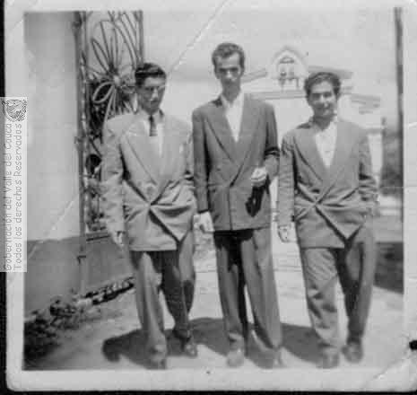 jaime Rayo y sus mejores amigos, lucen los clásicos y elegantes ternos cruzados tan de moda en los años 50's - 60's. Roldanillo, C. 1955.