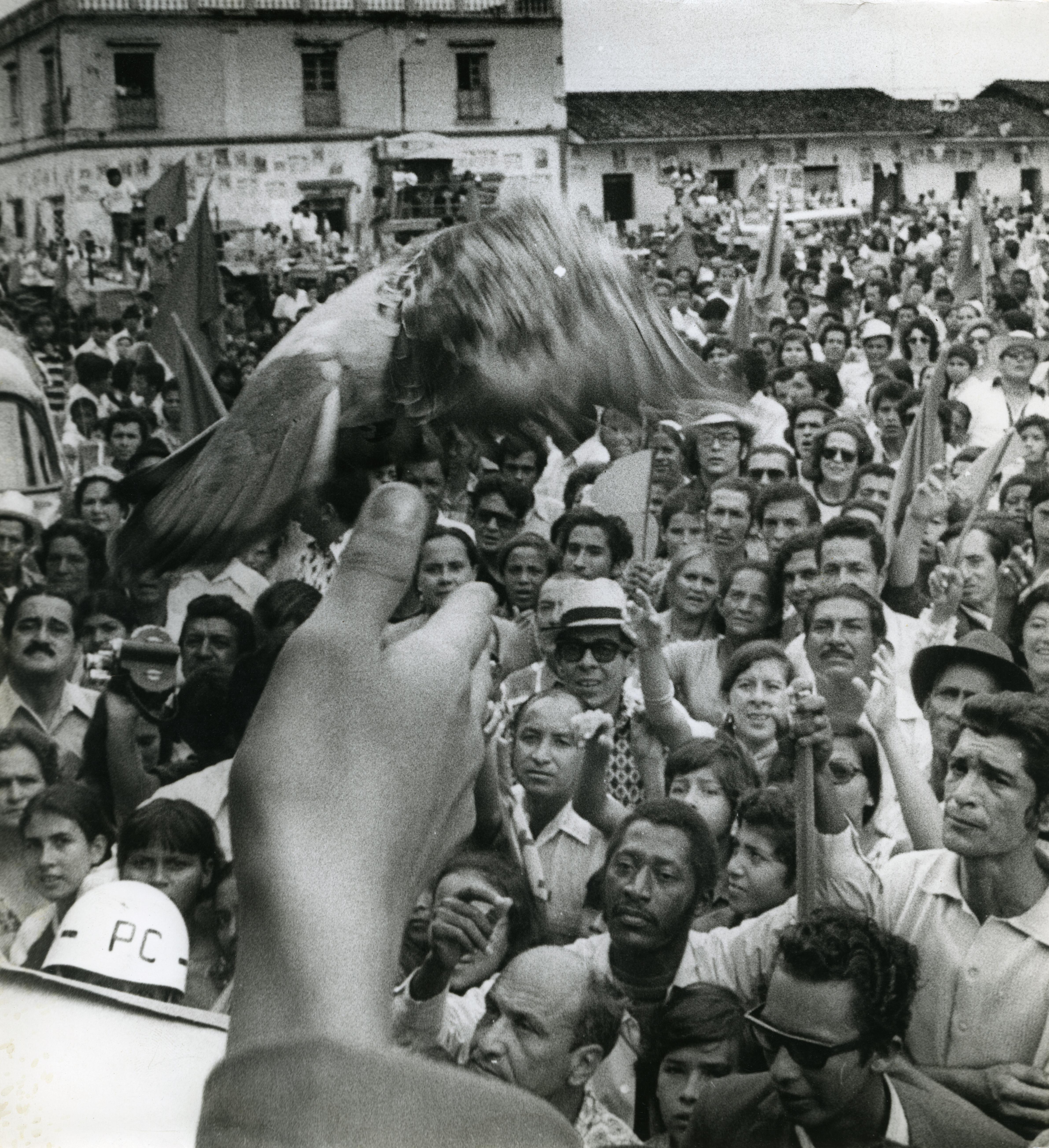 Álvaro Gómez Hurtado, abogado, político, escritor y periodista colombiano. Como político ocupó los cargos de Concejal de la ciudad de Bogotá, Representante a la Cámara, Senador de la República, Ministro Plenipotenciario, delegado en diferentes ocasiones a conferencias internacionales, Embajador ante las Naciones Unidas, Embajador en Suiza, Italia, Estados Unidos y Francia. Fue candidato a la presidencia en los periodos 1974, 1986,1990. En la gráfica observamos a el político Álvaro Gómez Hurtado acompañado de su esposa en campaña electoral en la ciudad de Jamundí