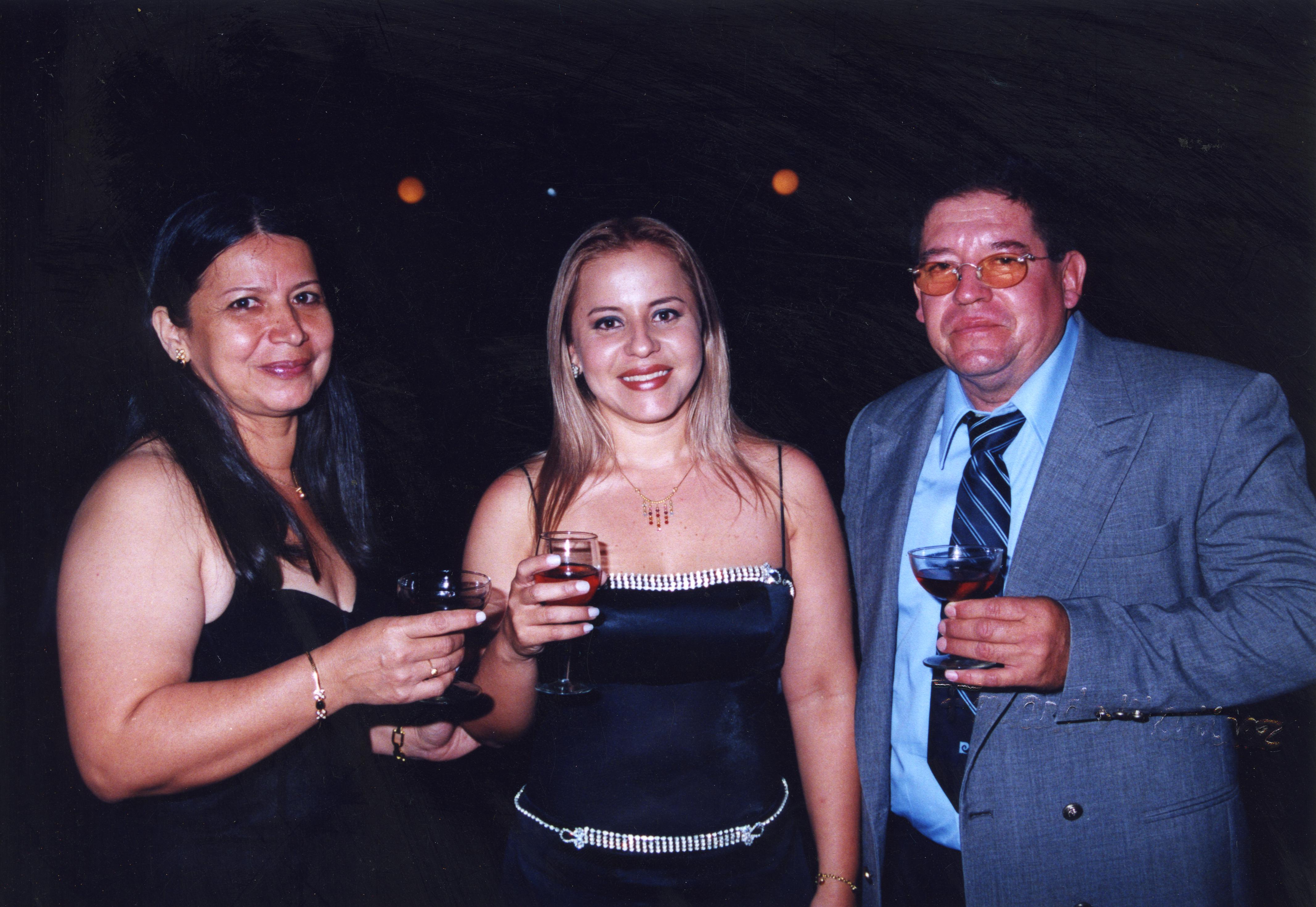 En la gráfica se aprecia a Nelsón Arcila, Sandra Milena Arcila, María Elena Márquez. Departen una copa de vino con motivo del día de grado administración de empresas en la Universidad Libre de Colombia