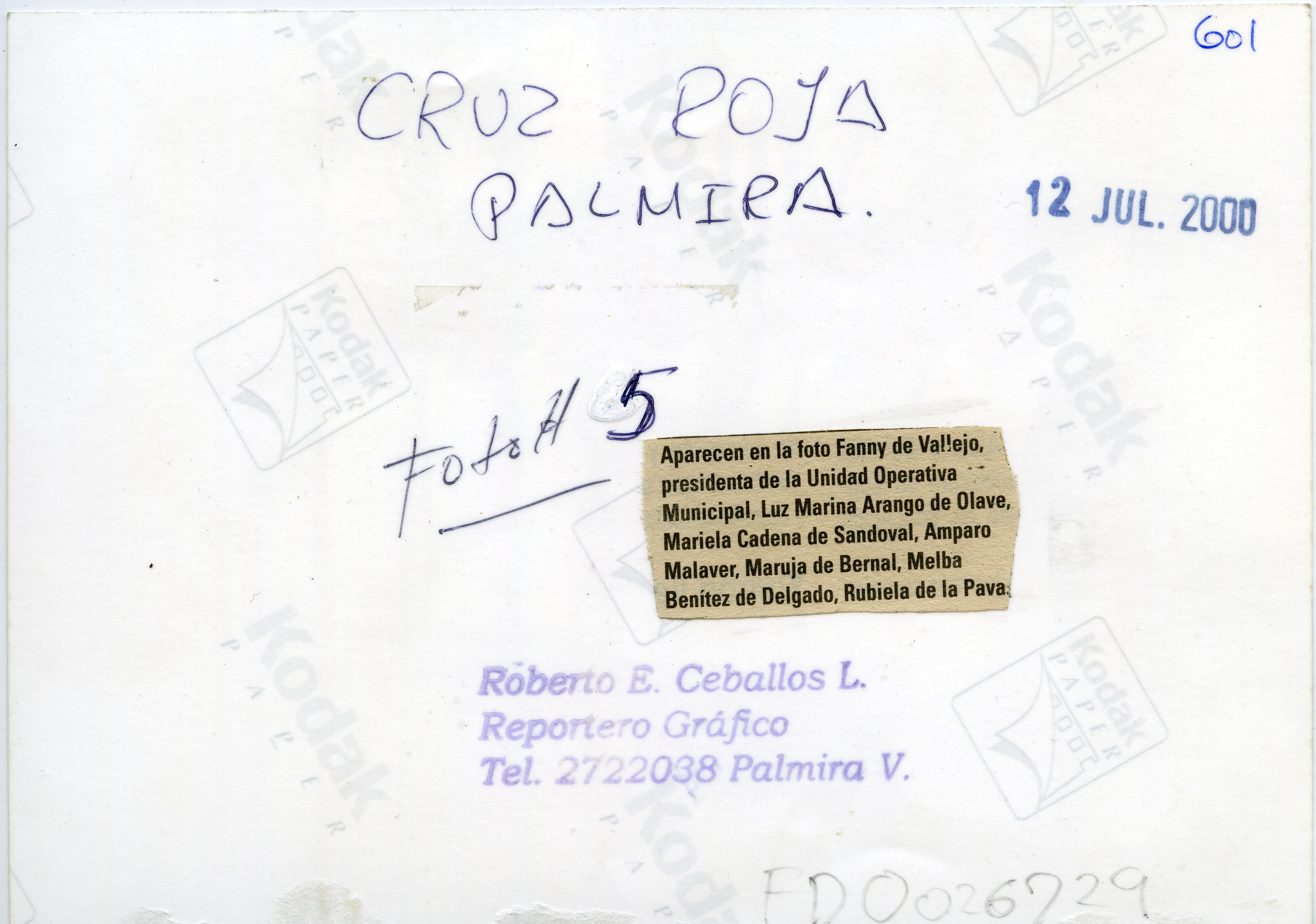 Reverso"Aparece en el foto Fanny de Vallejo, Presidente de la unidad operativa Municipal, Luis Marina Arango de Olave, Mariela Cadena de Sandoval, Amparo Malaver, Maruja de Bernal, Melba Benítez de Delgado, Rubiela de la Pava."
