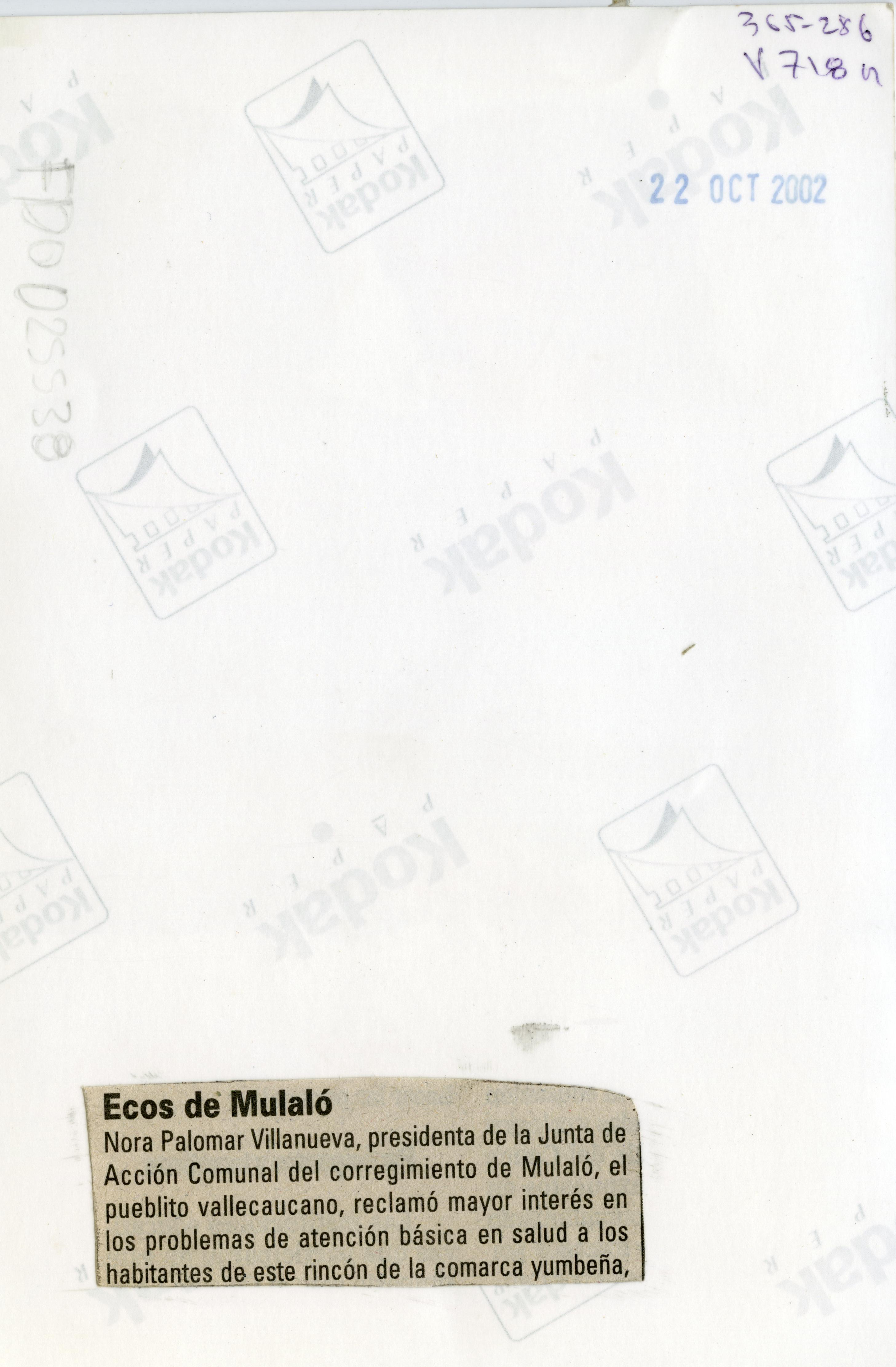 En la gráfica aparece Nora Palomar Villanueva, presidenta de la junta de acción comunal del corregimiento de Mulaló, el pueblito vallecaucano, reclamó mayor interés en los problemas de atención básica en salud a los habitantes de este rincón de la comarca yumbeña