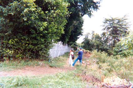 Plano general En toda la fotografía hay árboles y arbustos . Al centro vemos una cerca en guadua. Dos personas se encuentran parados en plano medio. Cielo blanco.