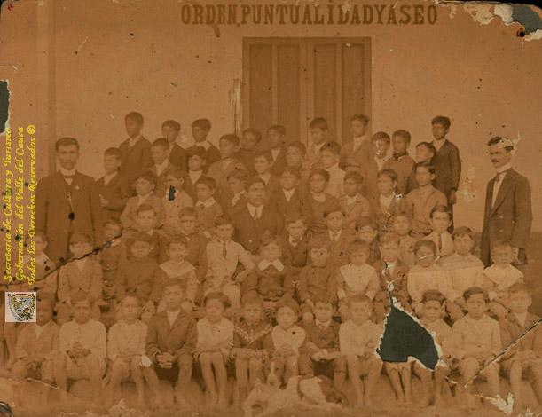 Alumnos y profesores de la Escuela de Varones, reslata el lema sobre la puerta: "Orden, Puntualidad y Aseo". Yotoco, 1912.