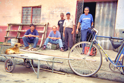 Plano medio. Un grupo de personas reunidas en el frente de una vivienda de color rojo claro, con un zócalo de color oscuro. En el extremo inferior a la derecha una bicicleta de color azul. Al extremo izquierdo un perro junto a las personas.