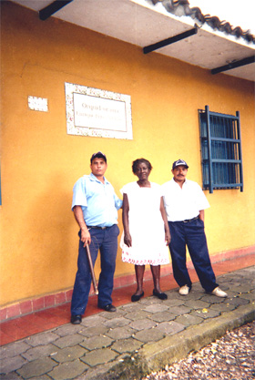 Plano medio. Vigilante y jardineros de Orquideorama, Germán, Miguelina y Filemón mirando a la cámara. Se destaca el color ocre de la edificación.