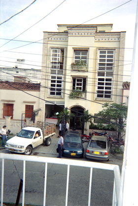 Se observa una reja de color blanco. En el plano medio cableado eléctrico. Al fondo Edificio de color habano. Vehículos estacionados. Plano general.