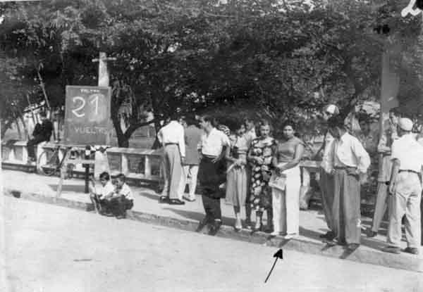 Saturia Rubiano, sirviendo de juez en un circuito de ciclismo en la Avenida Colombia. Santiago de Cali, C. 1950.