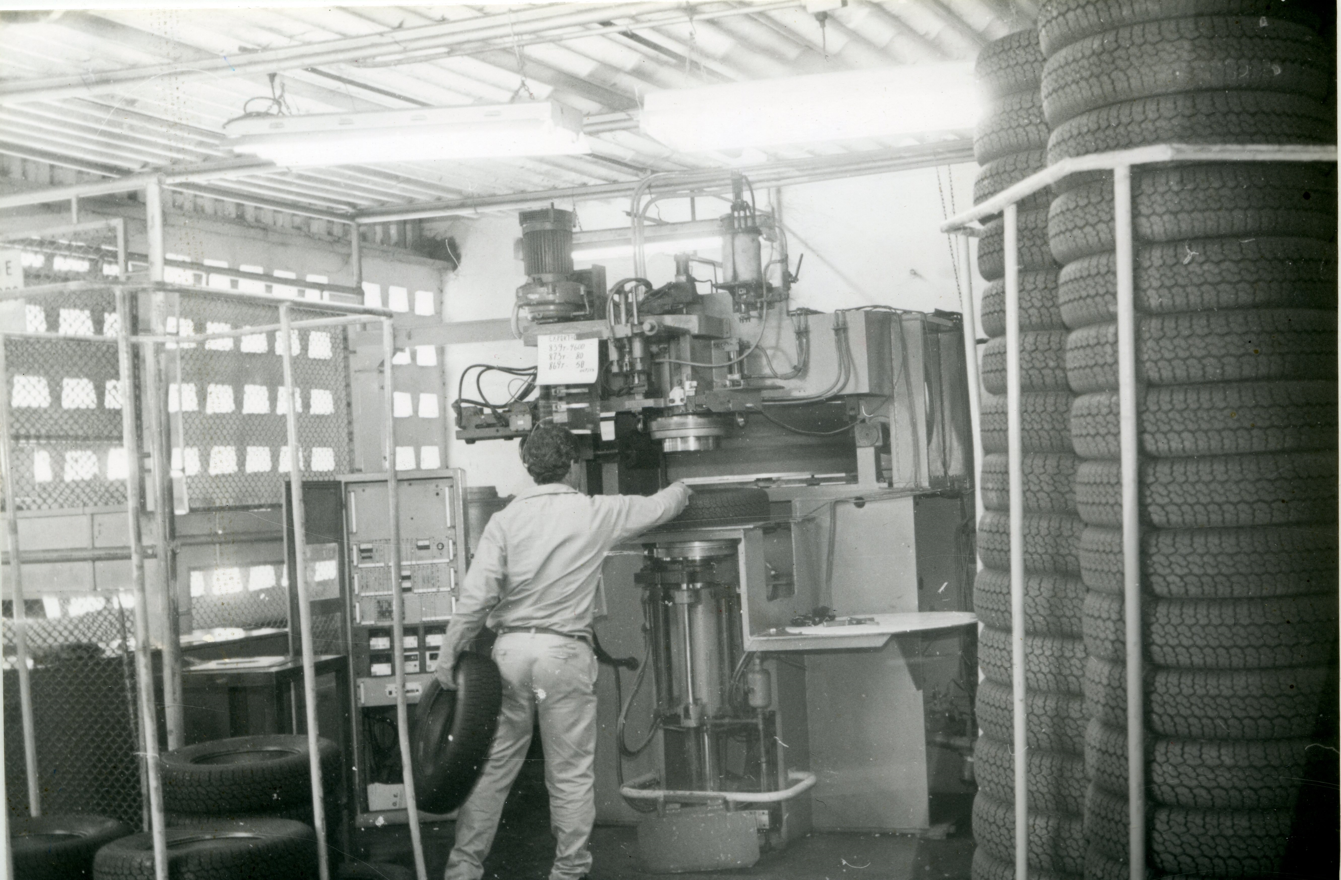 Operario manejando maquinaria para pruebas finales de calidad al interior de las instalaciones de la fábrica de llantas Good Year.