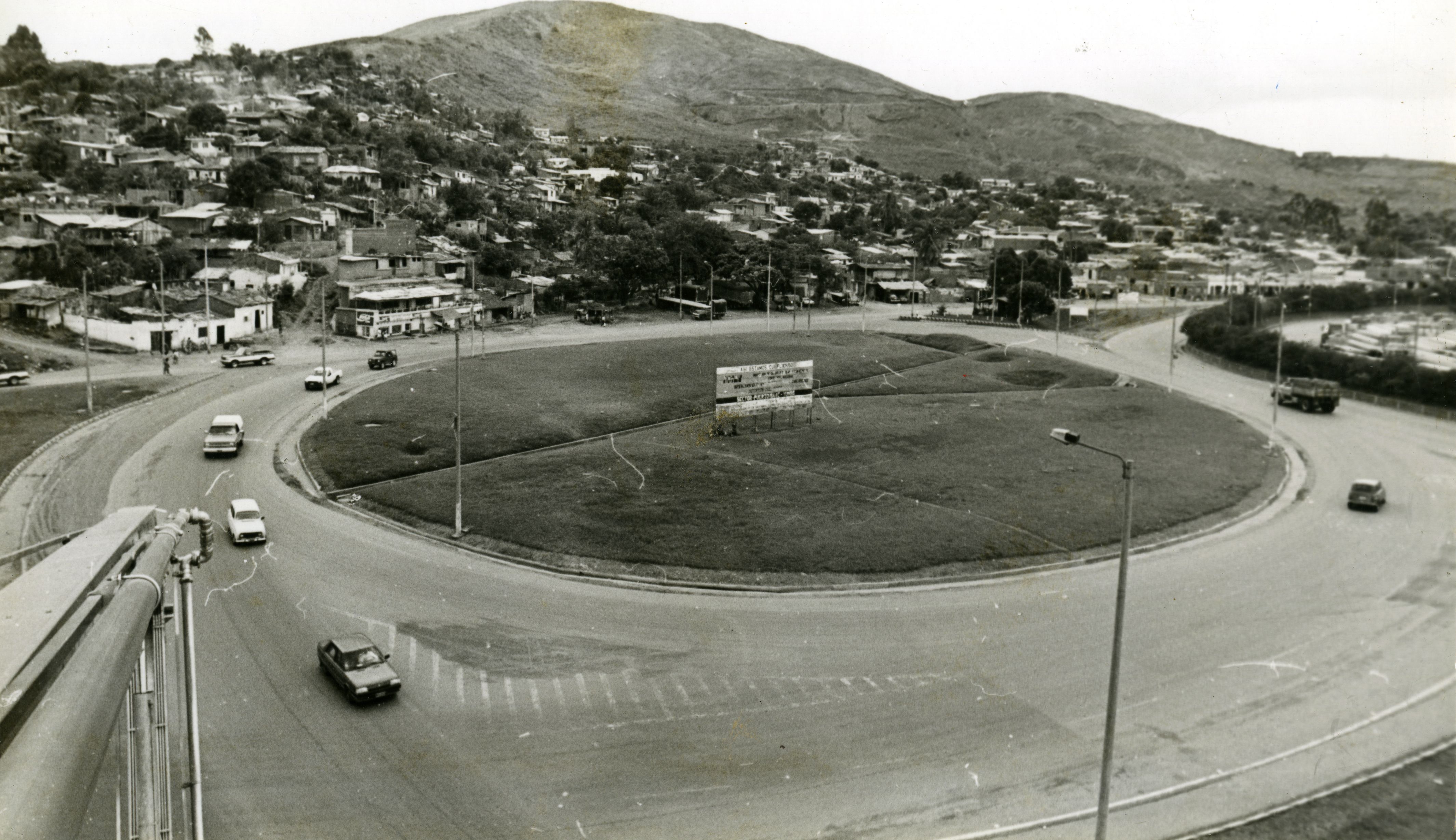 Fotografía panorámica, donde podemos observar una rotonda o rompoy, el cual tiene varios vehículos en la carretera, al fondo en una loma vemos un conglomerado de casas, también vemos unas montañas, en el medio de la rotonda se observa una cartel o valla