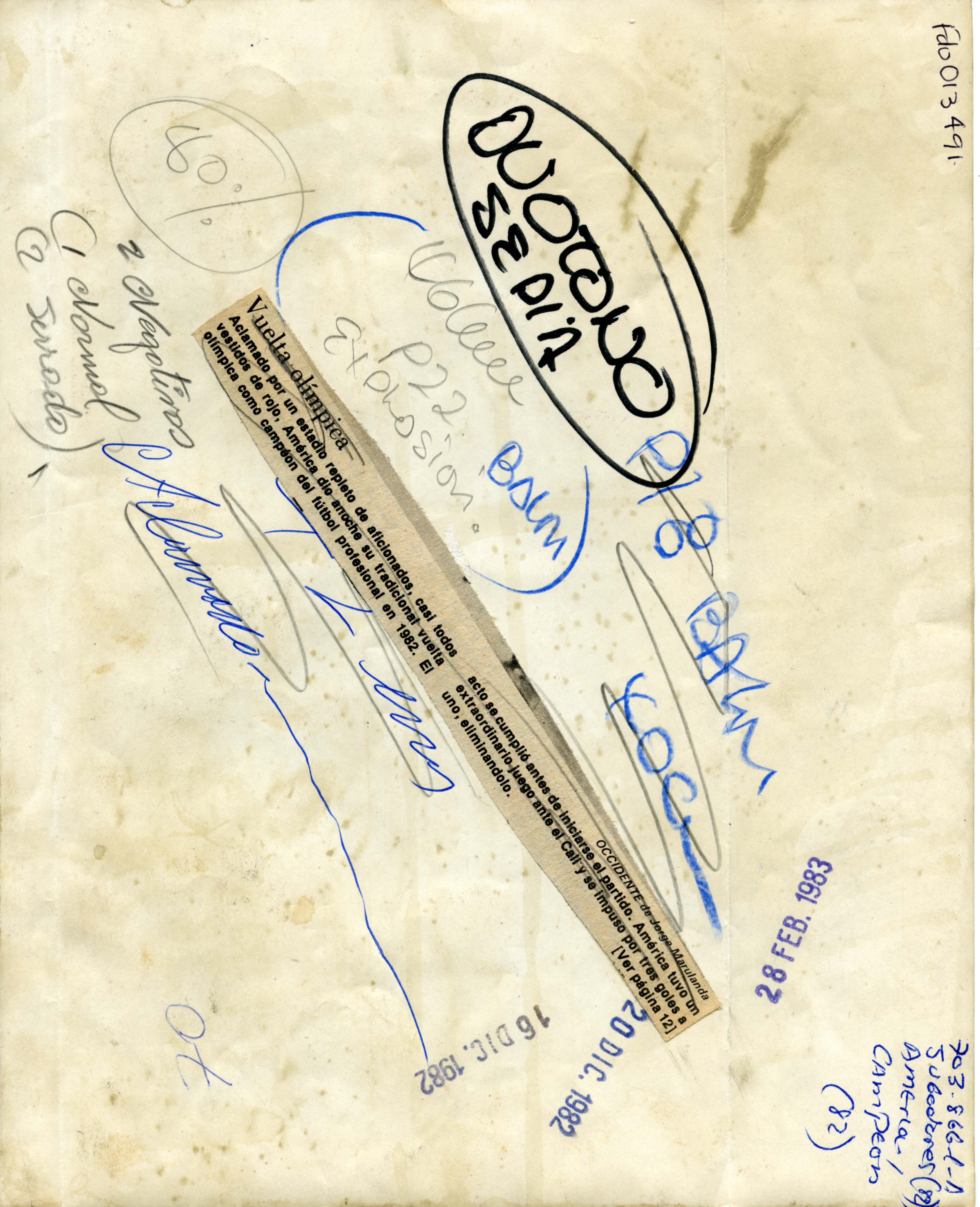 América de Cali dio la vuelta olímpica. Al reverso de la fotografía dice: Vuelta olímpica. Aclamado por un estadio repleto de aficionados, casi todos vestidos de rojo, América dio anoche su tradicional vuelta olímpica como campeón del fútbol profesional en 1982. El acto se cumplió antes de iniciarse el partido. América tuvo un extraordinario juego ante el Cali y se impuso por tres goles a uno, eliminandolo.