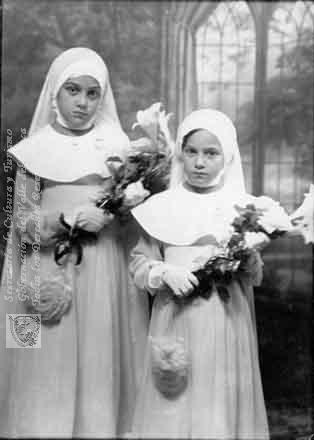 Ruth y Nohemí Scarpetta, el día de su primera comunión celebrada en el Liceo Benalcázar. Cali. C. 1935.