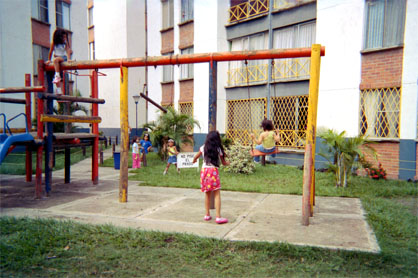 Plano de contexto. Niñas jugando. Predominio de línea en composición. Formas cuadriculadas y cuadriláteras de fondo.