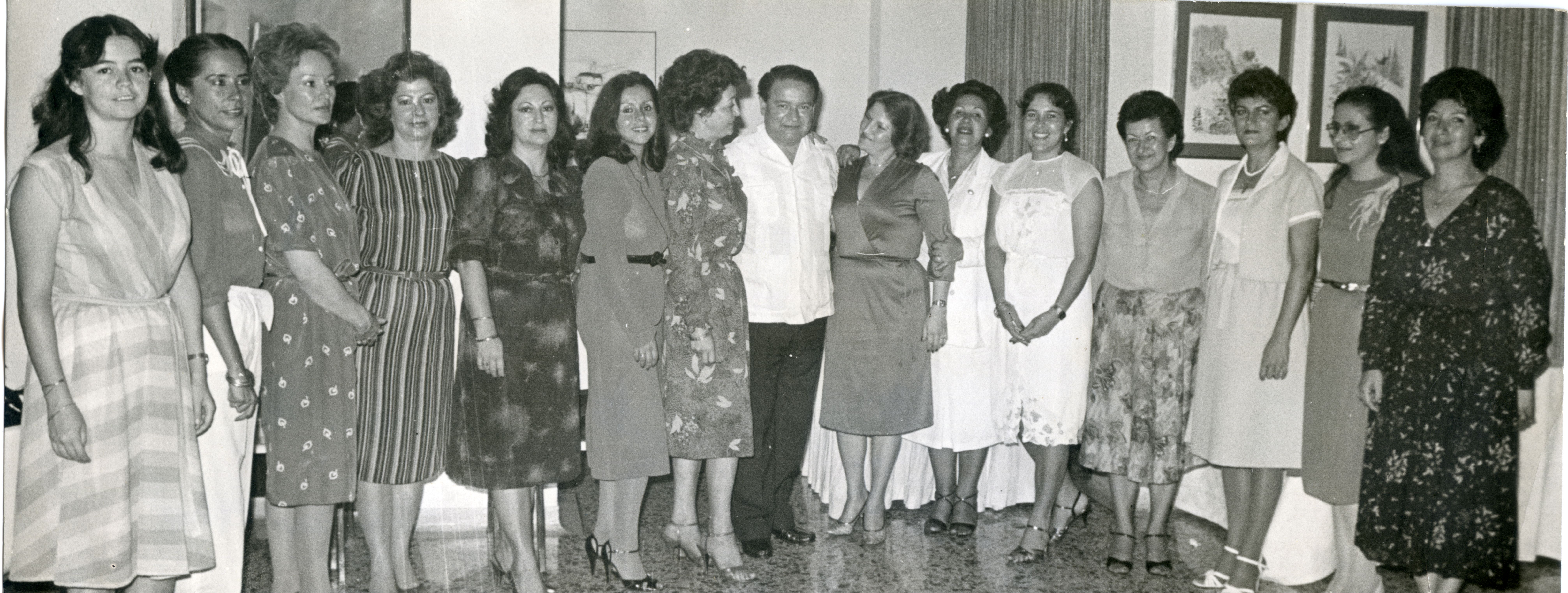 Humberto González Narváez, en agasajo con motivo de su cumpleaños. El acto se llevó a cabo en el Centro Social Imbanaco; se aprecia acompañado de damas asistentes al evento
