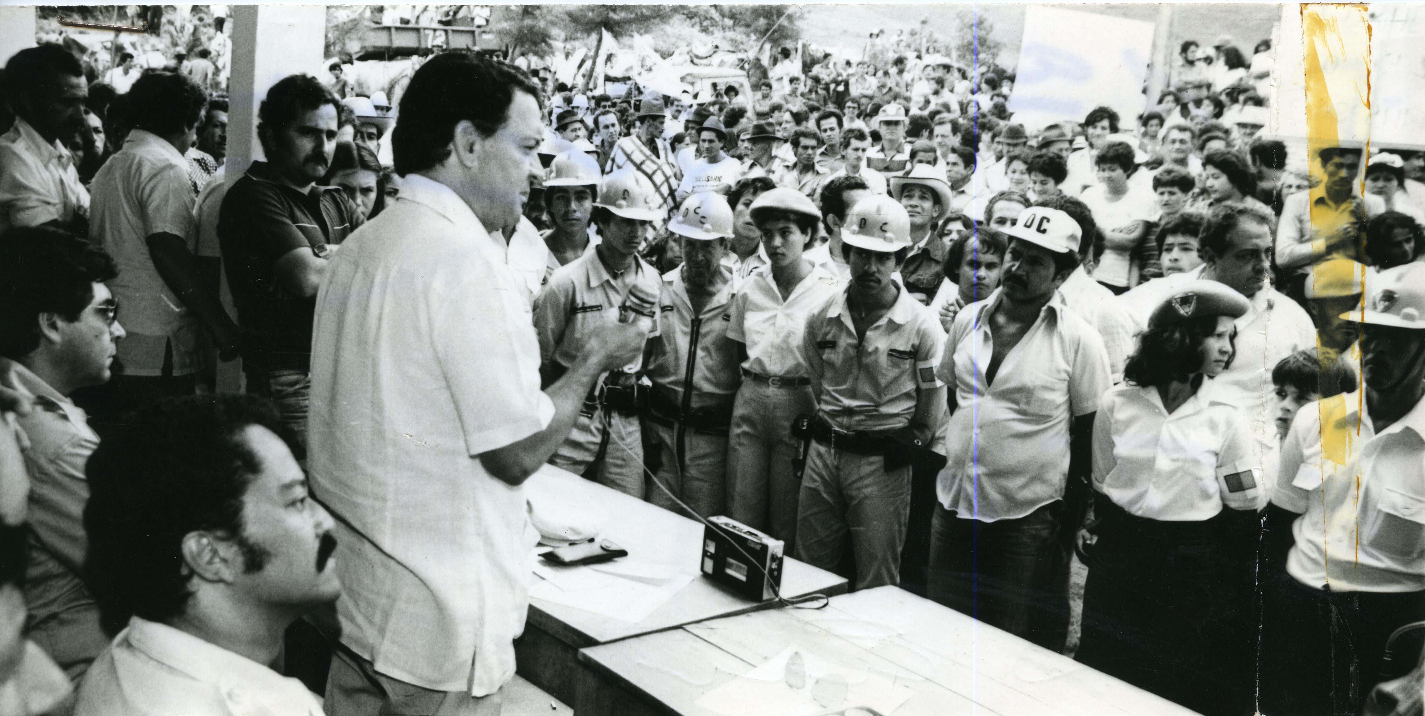 Fotografía de plano medio largo de Humberto González Narváez, donde se ve de pie, al lado de una mesa con un micrófono en su mano derecha, junto a él se observa un gran numero de personas que lo rodean y lo miran, junto a estos se destacan varias personas que portan uniformes y cascos