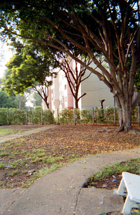 Plano medio. Perspectiva de edificios. Formas rectangulares sobresalen en edificio. Contraste de hojas secas sobre superficie lisa de edificios.