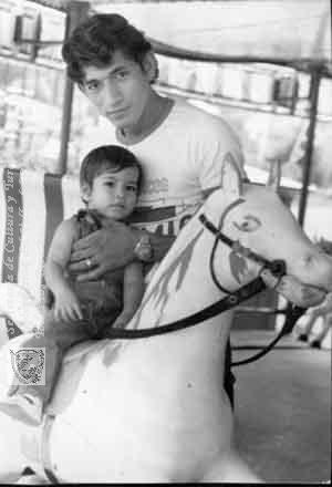 Alberto Mesa y la niña Katty Mejía disfrutando de las diversiones mécanicas de la rueda. Santiago de Cali, C. 1976.