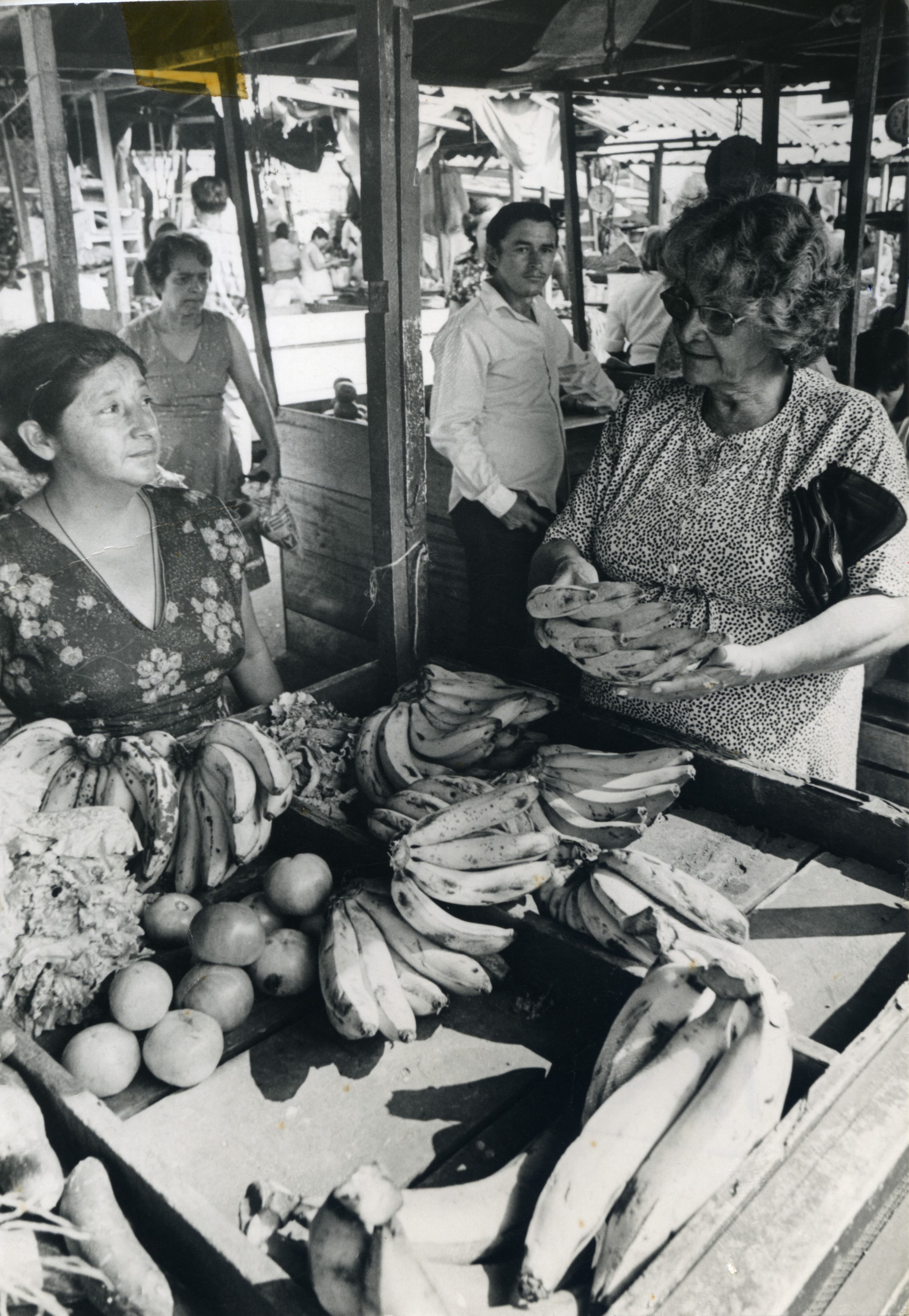Aspecto parcial de la galería Santa Elena. En primer plano se observa una mujer vendedora de banano.
