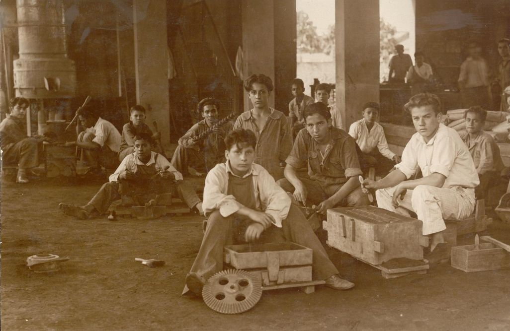 Instituto Antonio José Camacho, estudiantes trabajando en el taller de fundición. Esta institución se creo por Acuerdo Municipal No 25 de 1933, que ordeno construir una escuela de formación técnico-práctica, para dar respuesta a la necesidad de mano de obra capacitada, requerida por el crecimiento industrial y urbano de la ciudad. Actualmente lo conocemos como Instituto Educativo Técnico Industrial Antonio José Camacho. Santiago de Cali, 1950.