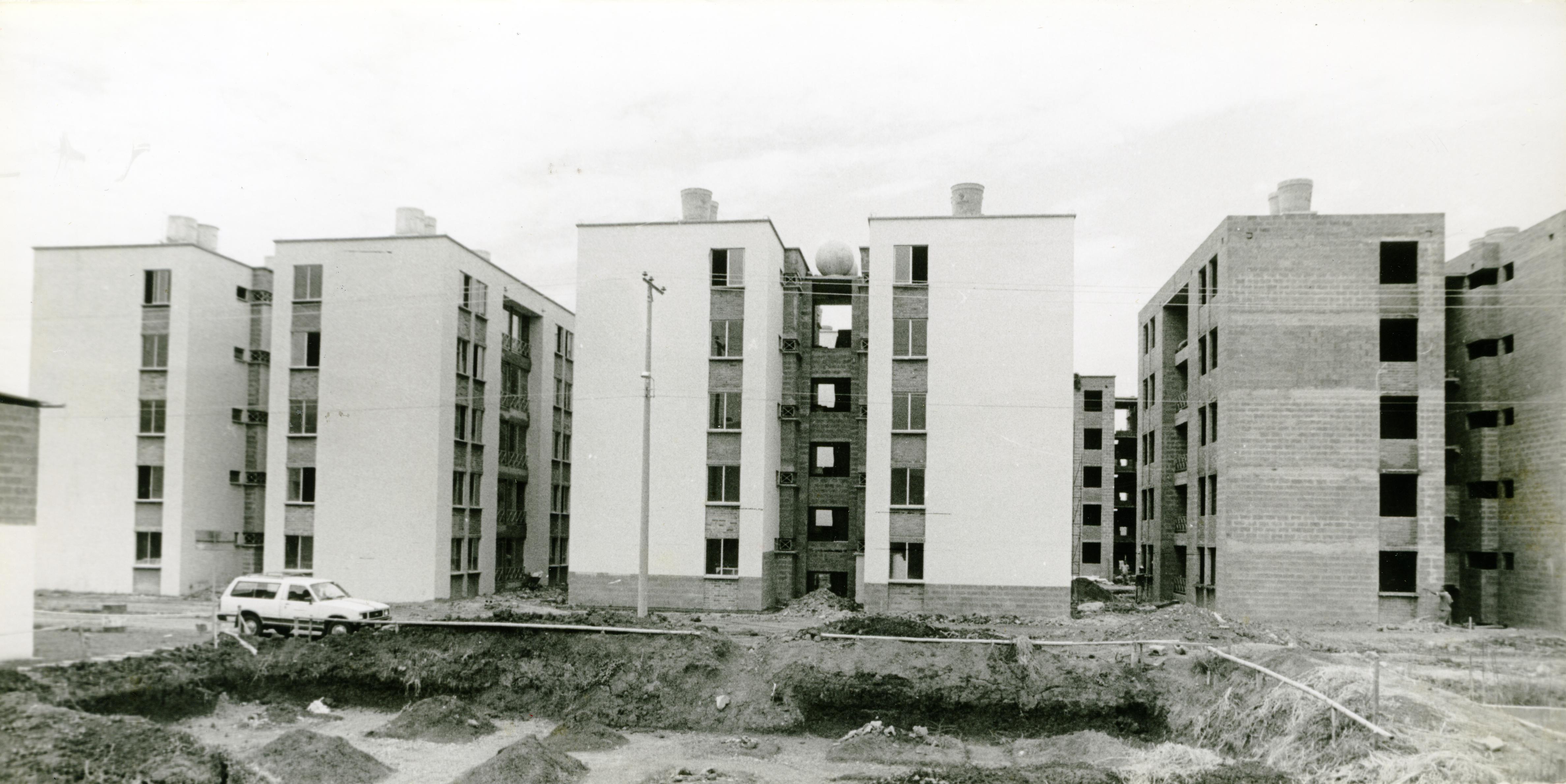 En la gráfica se observan algunos edificios pertenecientes al Barrio Torres de Comfandi. Frente a ellos se alcanzan a ver algunos postes de luz, cables de electricidad y un auto estacionado. Encima de los edificios se ven tanques de agua.