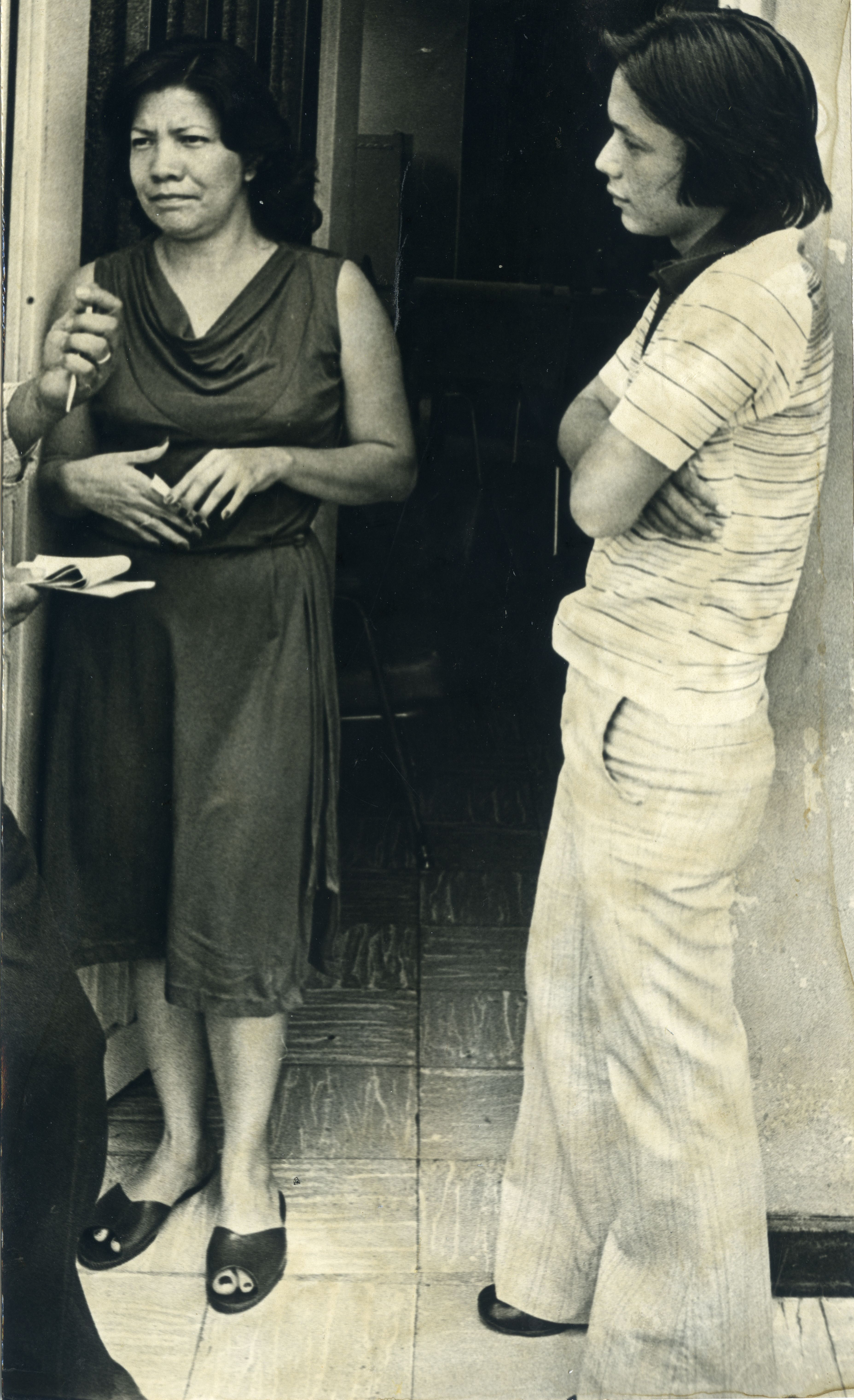 Fotografia de plano completo de Leyda Pabón y Omar, donde se observa a una mujer con falda pantalon ancho, de cabello abundante al pie de la puerta de una casa y junto a ella se ve a un joven de cabello largo con buso de manga corta con los brazos cruzados.