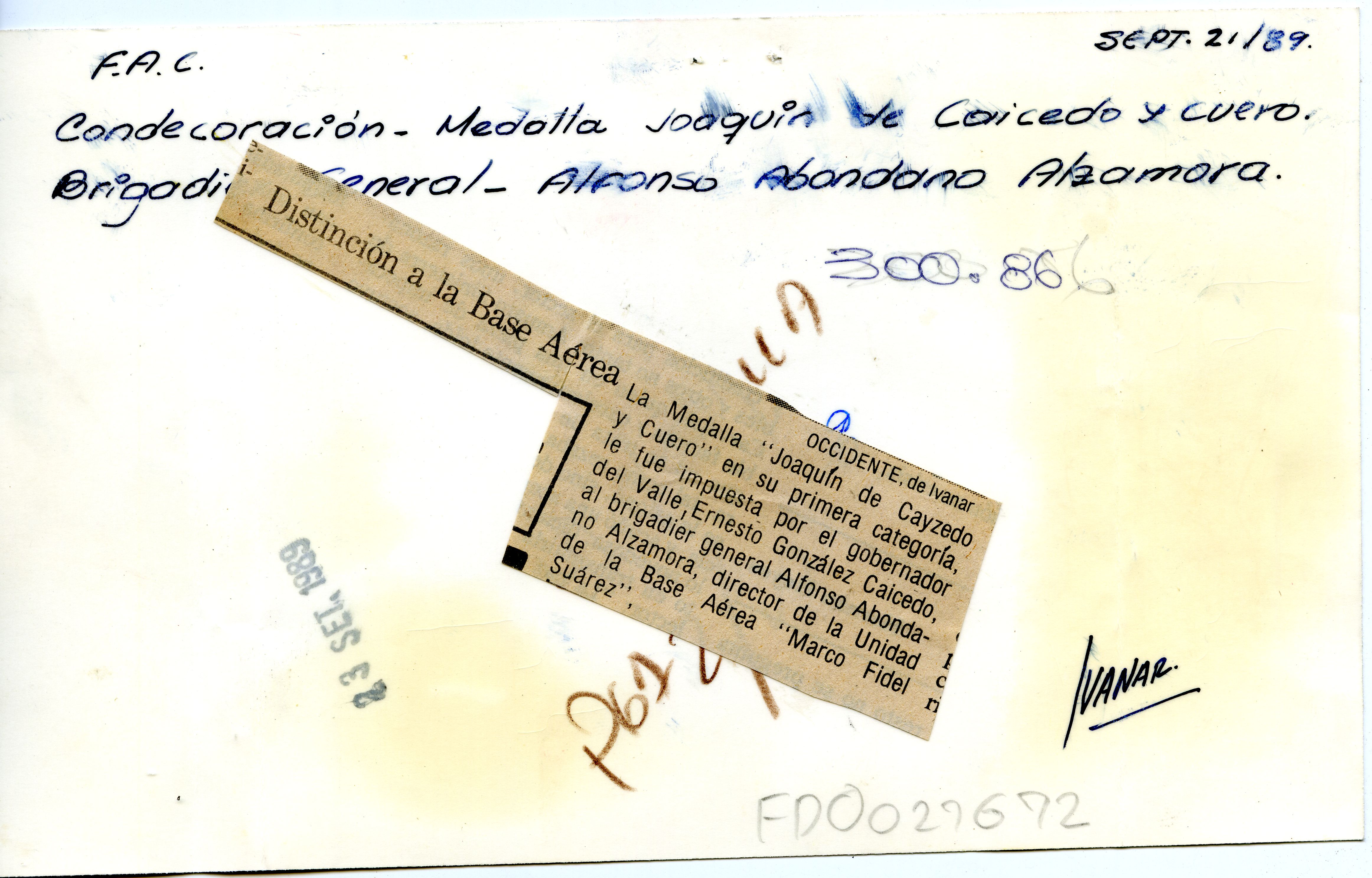 Reverso:"Distinción a la Base Aérea. La medalla "Joaquín de Cayzedo y Cuero" en su primera categoría, le fue impuesta por el gobernador del Valle, Ernesto González Caicedo, al brigadier general Alfonso Abondano Alzamora, director de la Unidad de la Base Aérea "Marco Fidel Suárez"."