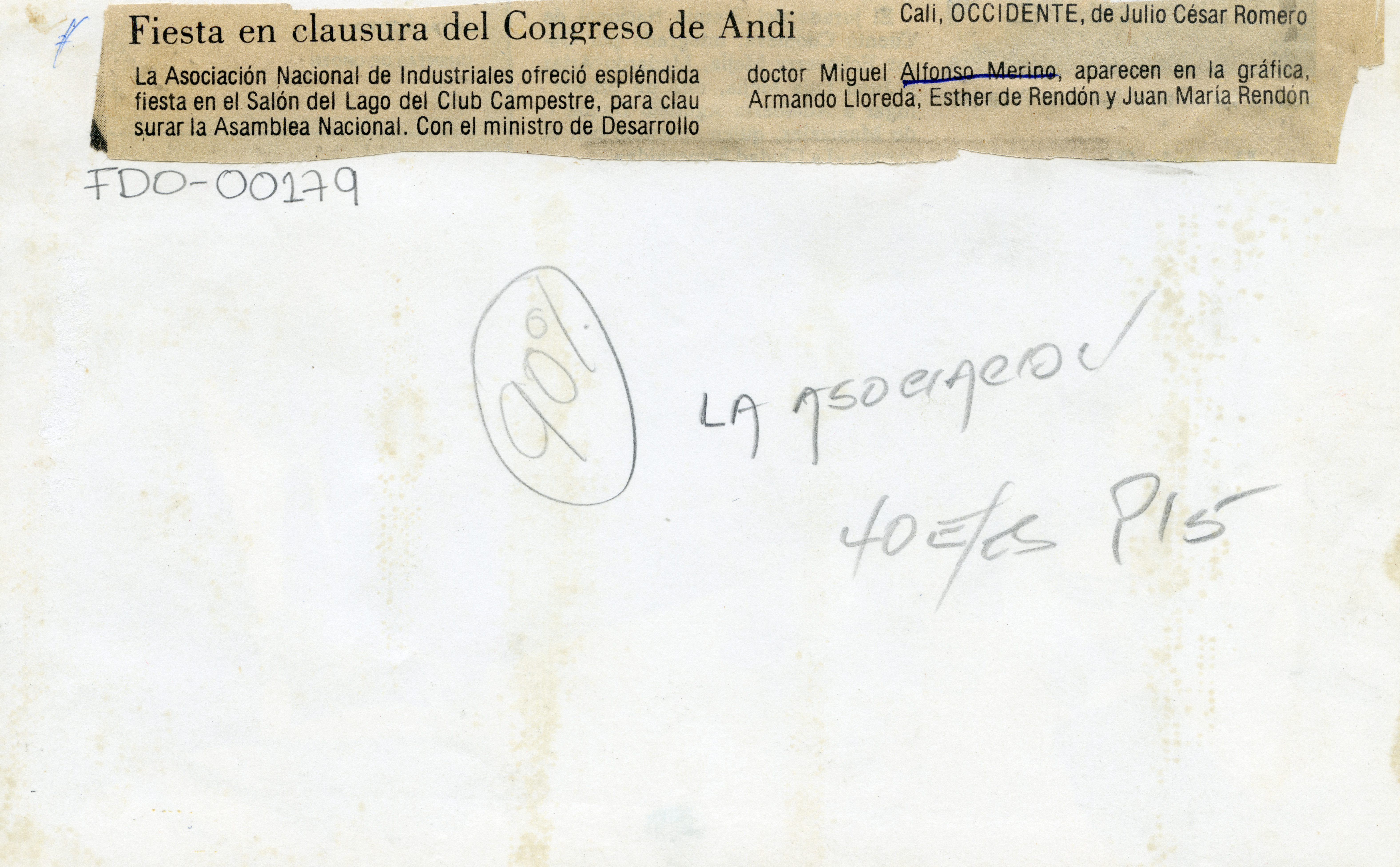 La Asociación Nacional de Industriales (Andi) ofreció una esplendida fiesta en el salón del lago del Club Campestre, para clausurar la Asamblea Nacional. Estuvieron presentes el ministro de desarrollo el doctor Miguel Alfonso Merino, Armando Lloreda, Esther de Rendón, Juan María Rendón entre otros. El Archivo del Patrimonio Fotográfico y Fílmico del Valle del Cauca es responsabilidad de la Biblioteca Departamental del Valle Jorge Garcés Borrero, por convenio de cooperación suscrito con la Secretaria del Cultura Departamental, con el fin de aunar esfuerzos para su conservación, preservación y divulgación del Archivo entre la comunidad Vallecaucana, especialmente entre los estudiantes e investigadores que visitan la Biblioteca, propiciando el su uso y consulta permanente. La universidad Icesi es un colaborador en el proceso de difusión, facilitando la tecnología que permite la consulta de las imágenes.