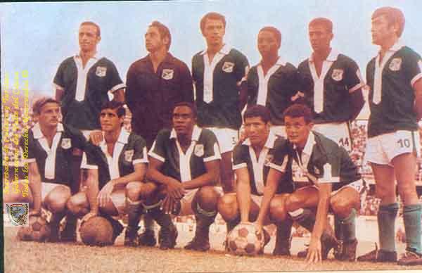 Miembros del Deportivo Cali. De pie: Juan Martínez, Rosendo Toledo, Oscar López, H. Valencia, Mario Sanclemente y Mario Desiderio. Sentados: Roberto Alvarez, Jose Judicca, Jorge Gallego, Benicio Ferreira e Iroldo. Cali.