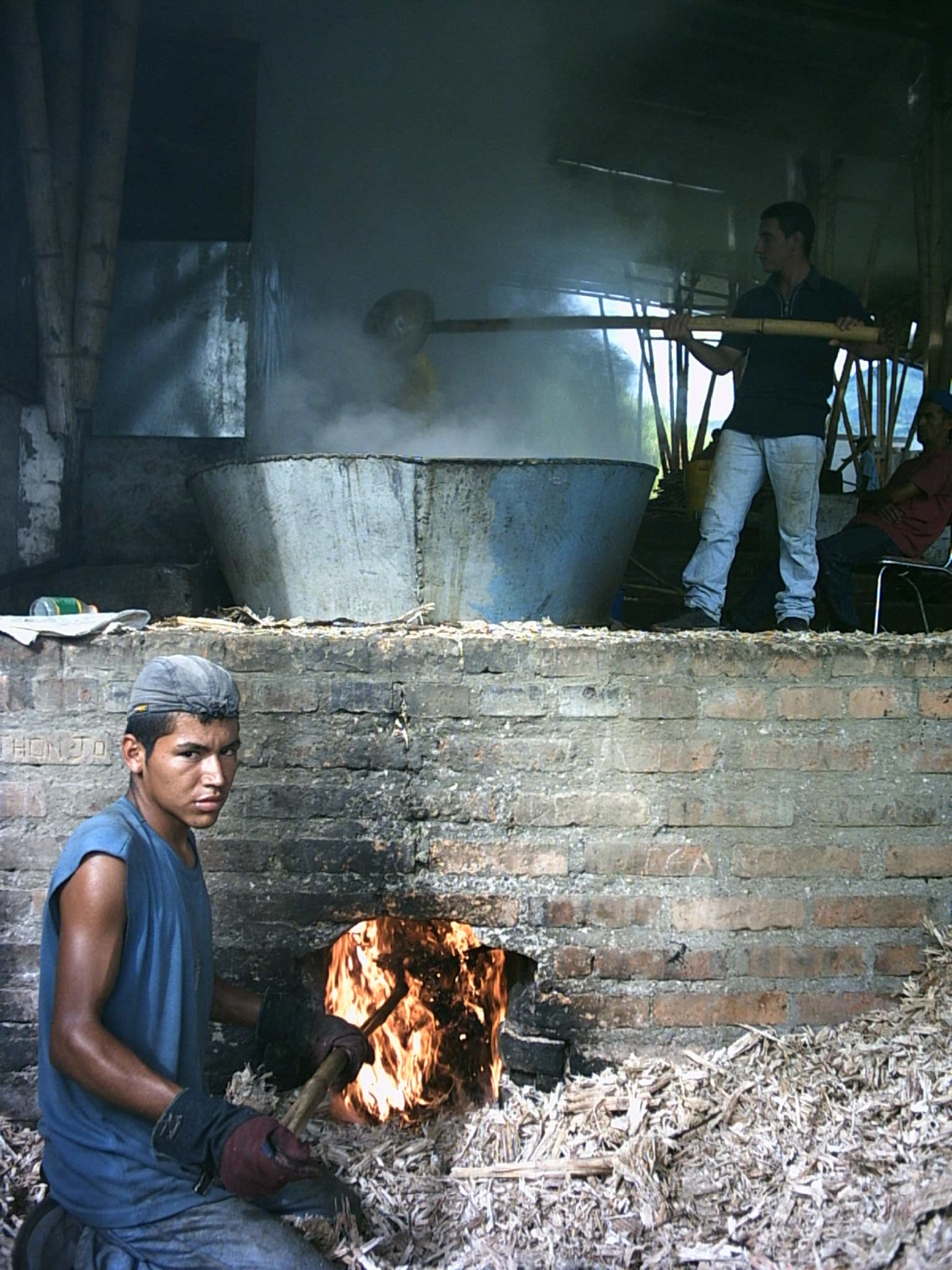 Ansermanuevo, Valle del Cauca. Fundado 15 agosto de 1539, por el Mariscal Jorge Robledo, Se convirtió en municipio por ordenanza 29 de abril de 1925. El municipio tiene actividades económicas importantes como Trapiche de Panela. Se aprecia dos jóvenes trabajando en la elaboración de panela artesanal