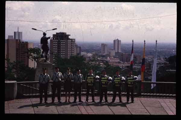 Grupo de la policia Motorizada en una ceremonia realizada en la estatua a Sebastian de Belalcázar. Santiago de Cali, C. 1998