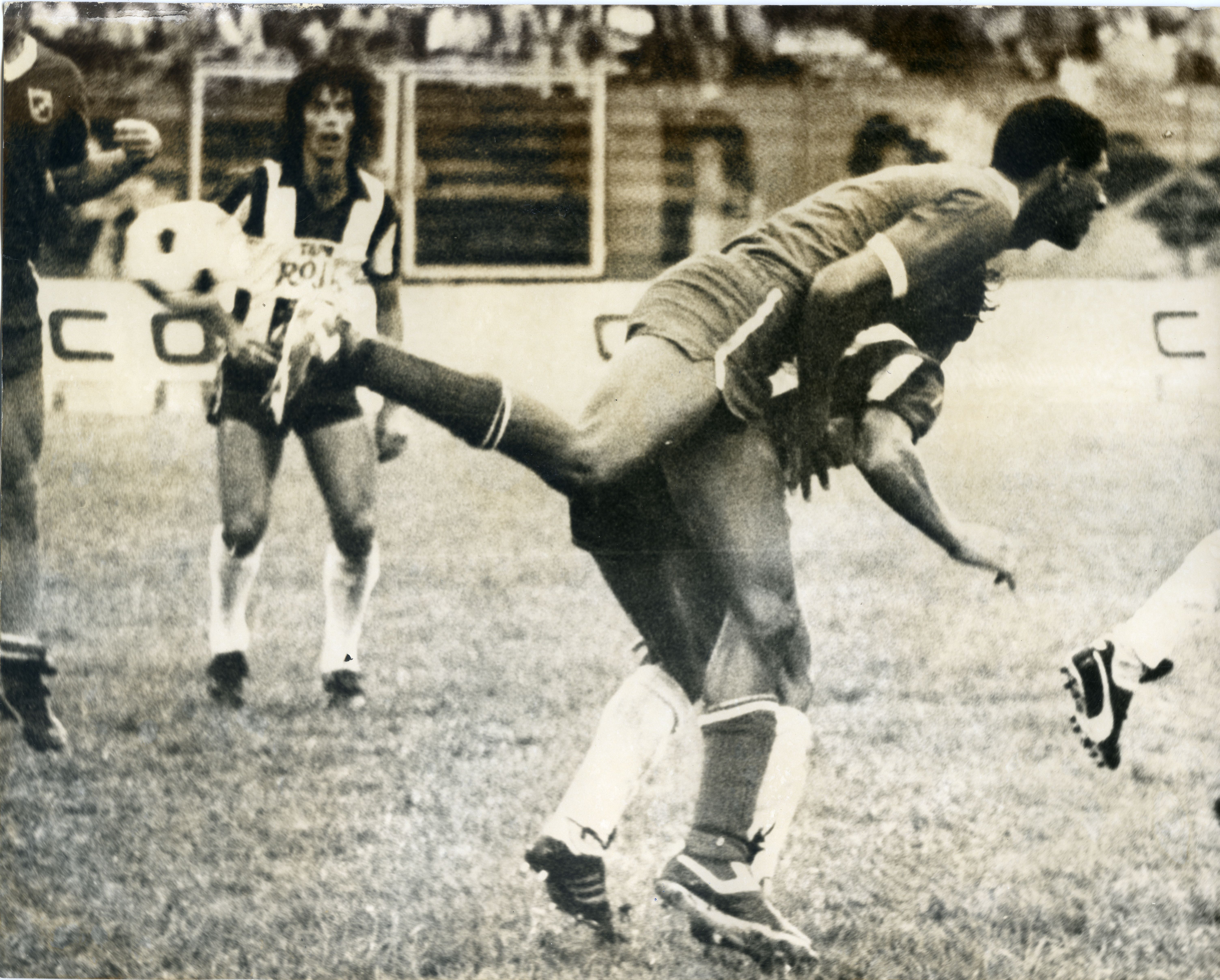 Fotografia de plano completo de dos jugadores, uno del America de Cali y el otro del Tolima, donde se aprecia al jugador Americano en el aire, apoyado en el hombro del jugador Tolimense, más atras se ve el balon y a otro jugador pendiente de la jugada