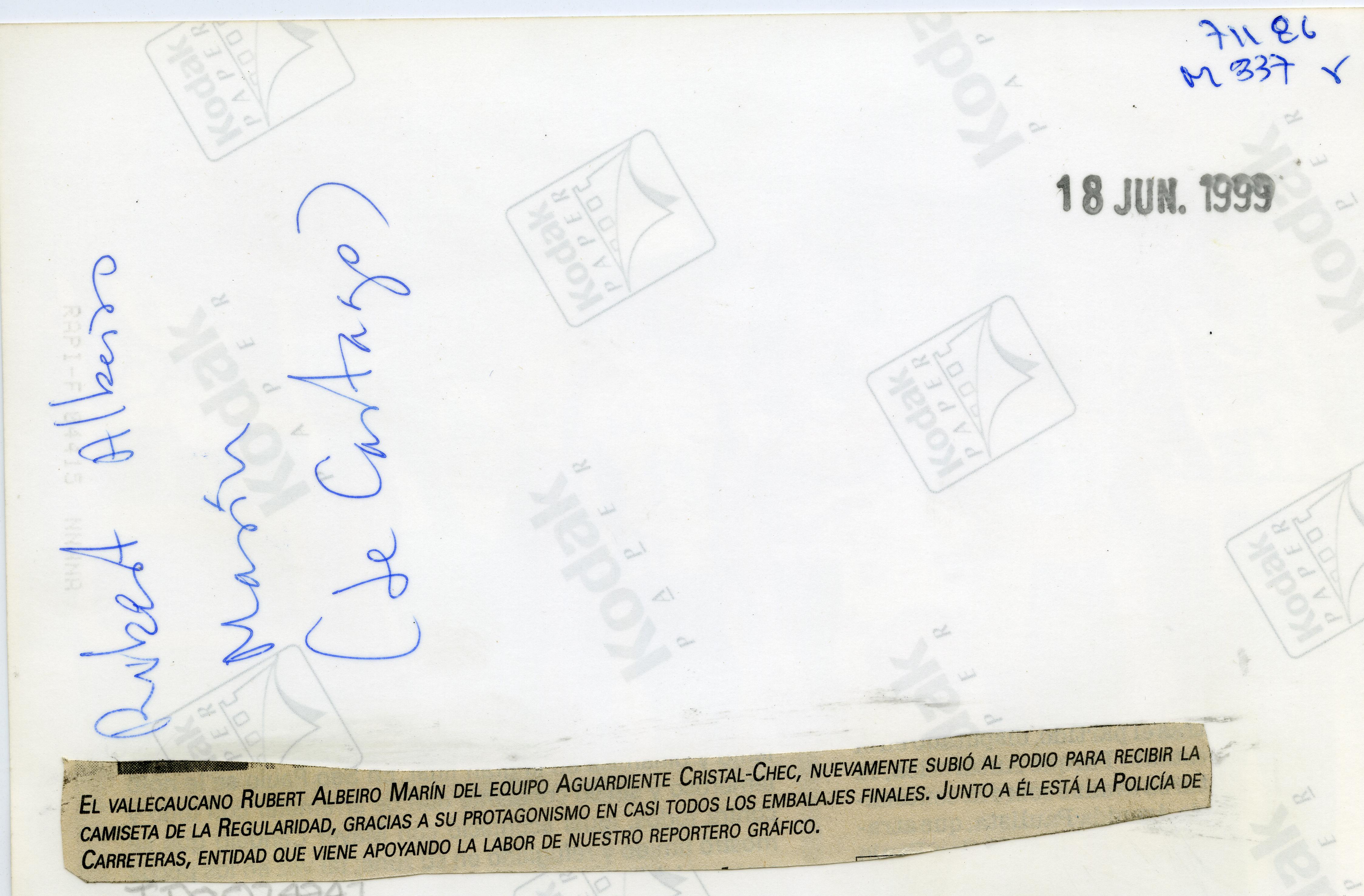 Al reverso de la fotografía se anexa recorte: El vallecaucano ruber Albeiro Marín del equipo Aguardiente Cristal-Chec, nuevamente subió al podio para recibir la camiseta de la regularidad gracias a su protagonismo en casi todos los embalajes finales. Junto a él está la policía de carreteras, entidad que viene apoyando la labor de nuestro reportero gráfico