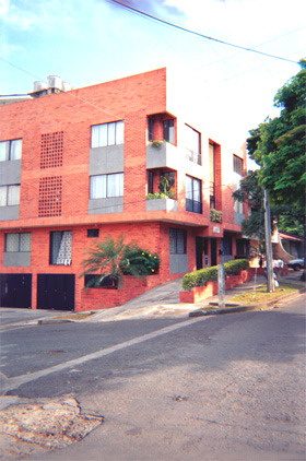 Plano medio. Edificación de tres plantas. Fachada en ladrillo pulido. Sombras producidas por los árboles en horas de la tarde.