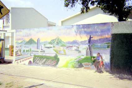 | dc.description | Primer plano. Un mural alusivo a Cali y sus lugares representativos, al extremo derecho la representación de una mujer que vende chontaduros. Los colores son variados y vivos. | spa |